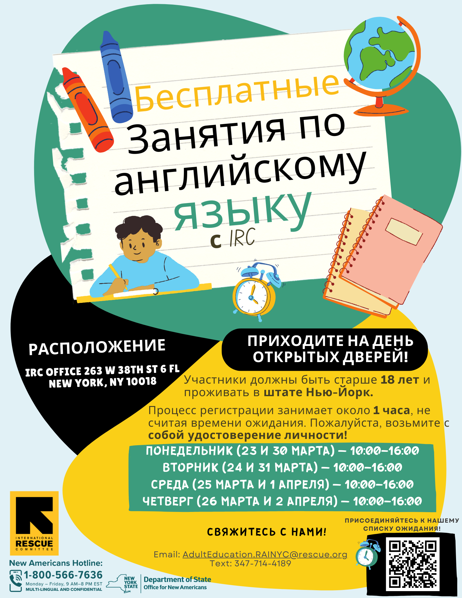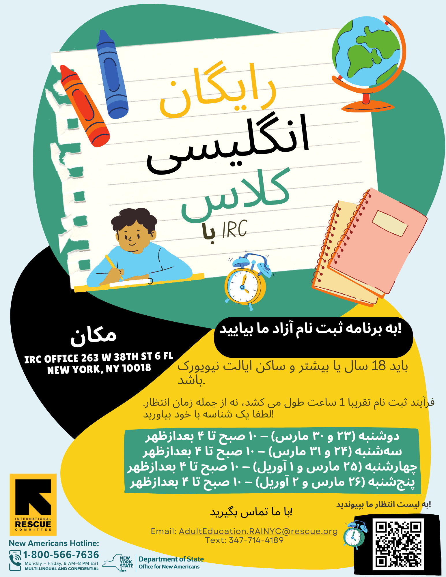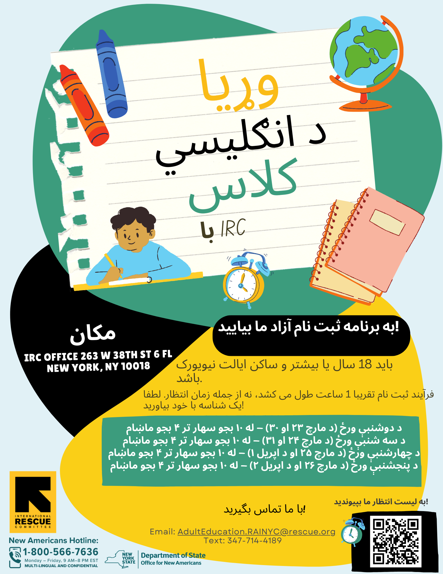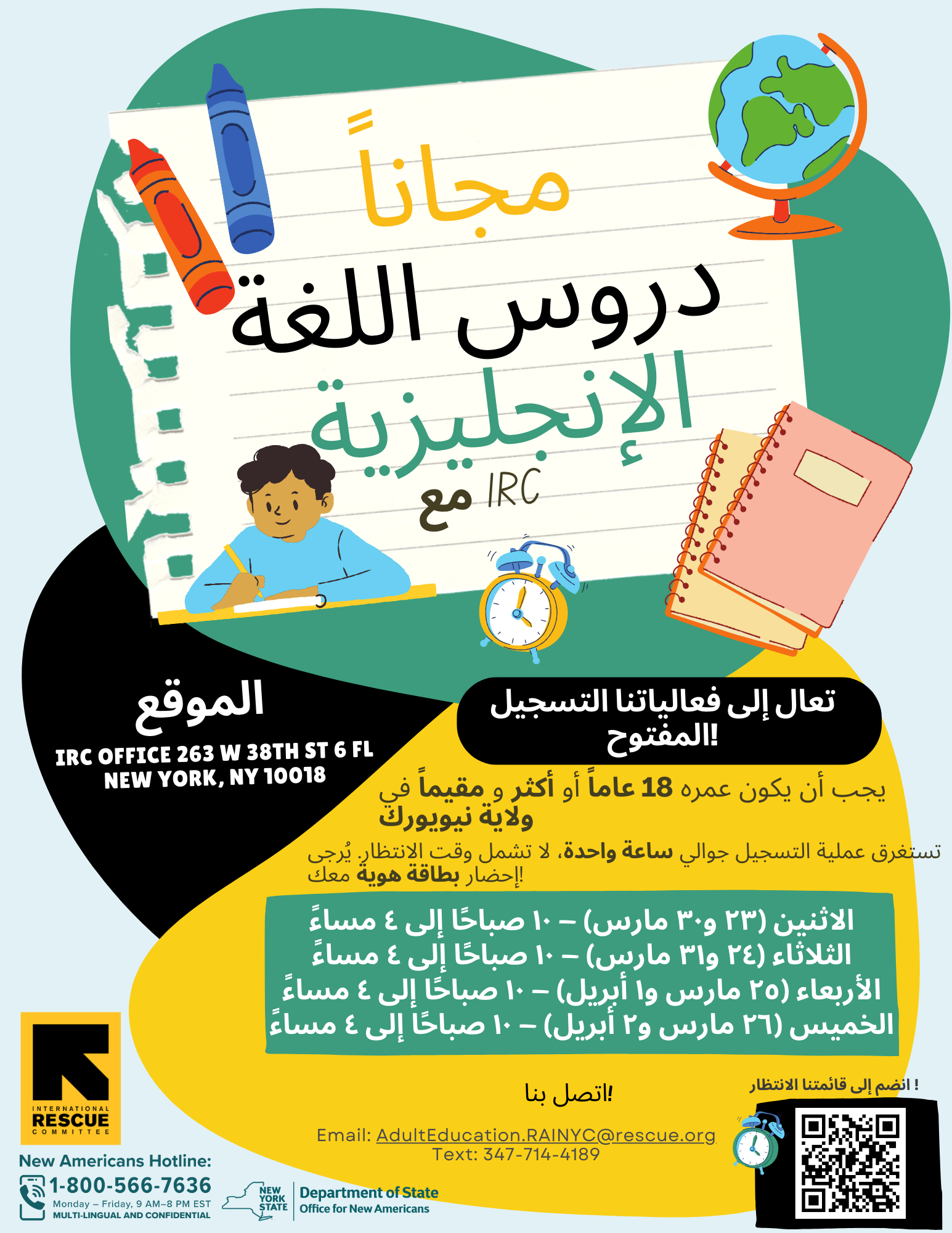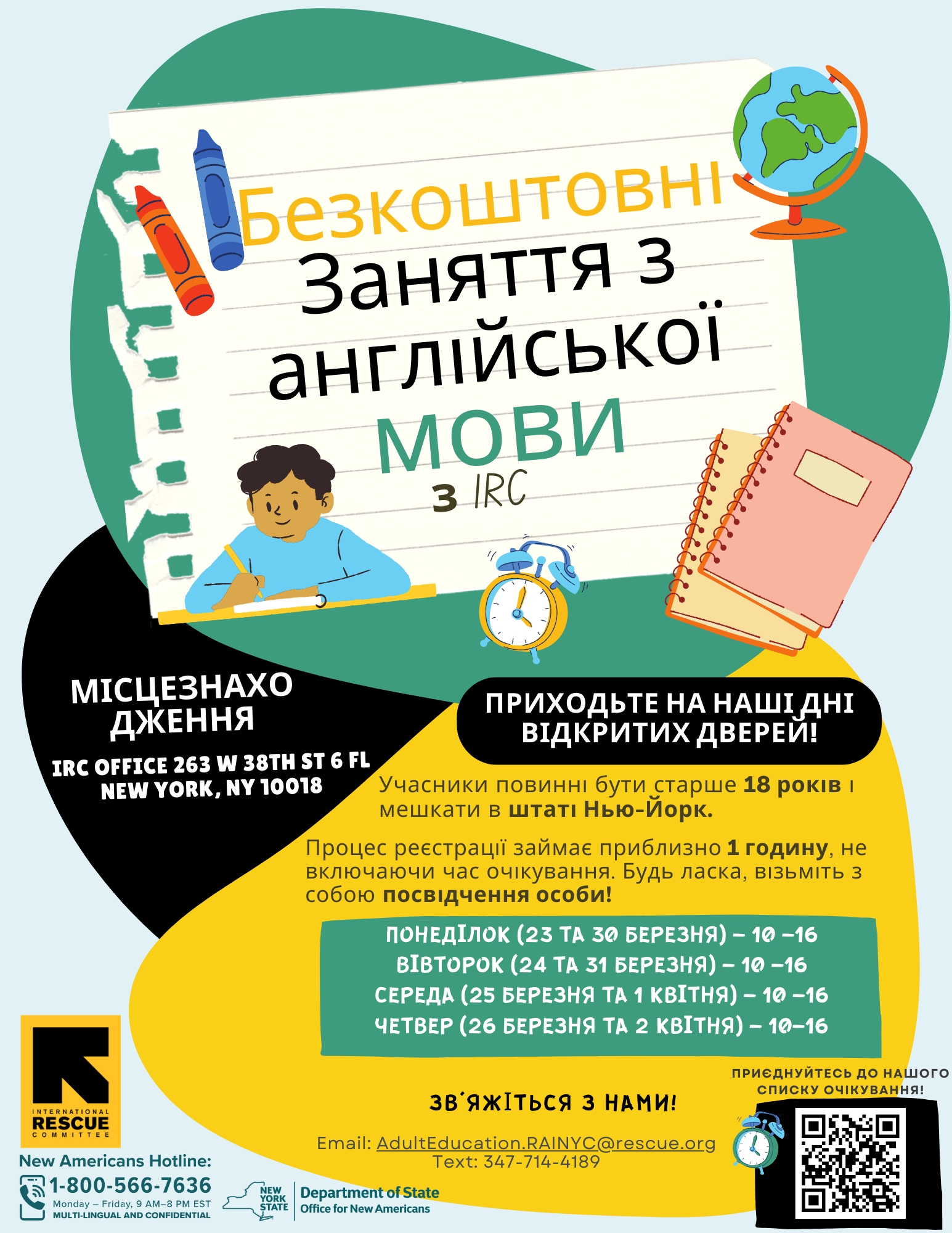 This flyer provides information on upcoming English classes with the IRC in NY in March of 2026.